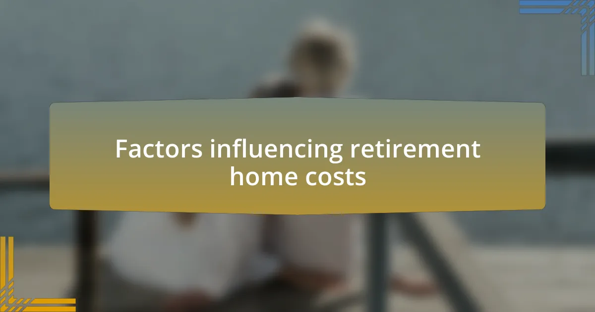 Additionally, the level of care provided can greatly influence costs. I had an eye-opening conversation with a resident who required specialized healthcare, reflecting on how the tailored services impacted her monthly budget. It made me realize that for many, the peace of mind that comes with personalized care far outweighs the financial considerations. Have you ever thought about how crucial proper care is in making a retirement decision? It’s a vital component that shouldn’t be overlooked.